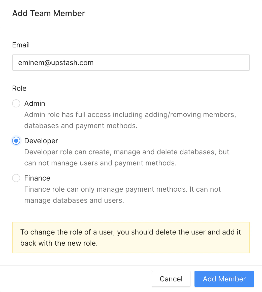 While adding a team member you need to select a role. Here the privileges of each role:- Admin: This role has full access including adding removing members, databases, payment methods.