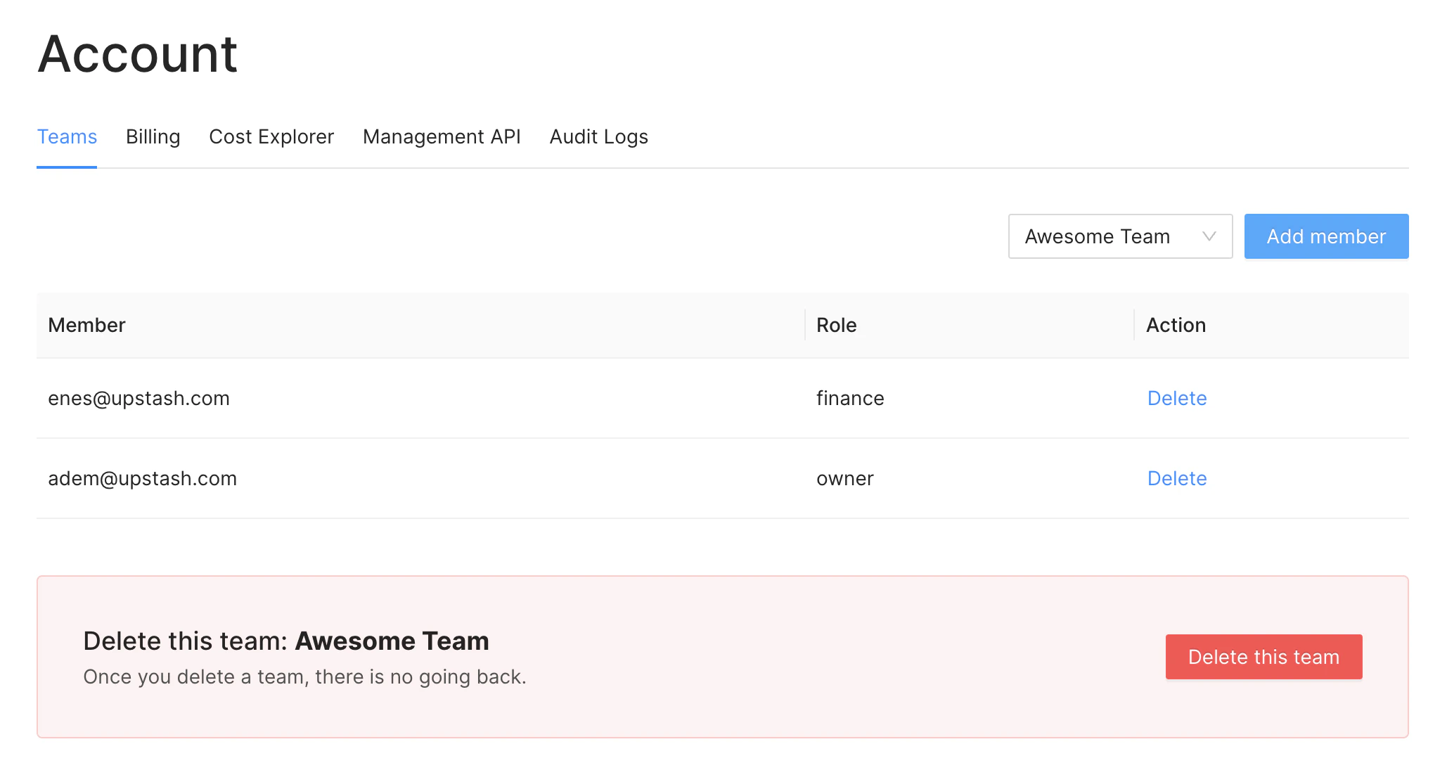 Once you switched to a team, you can add team members inAccount > Teams if