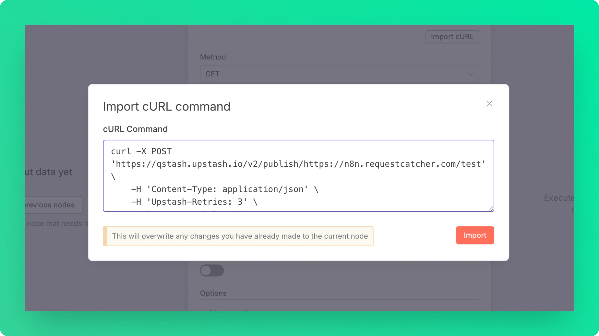 - Back to the n8n, in HTTP Request Parameters tab, use import cURL.