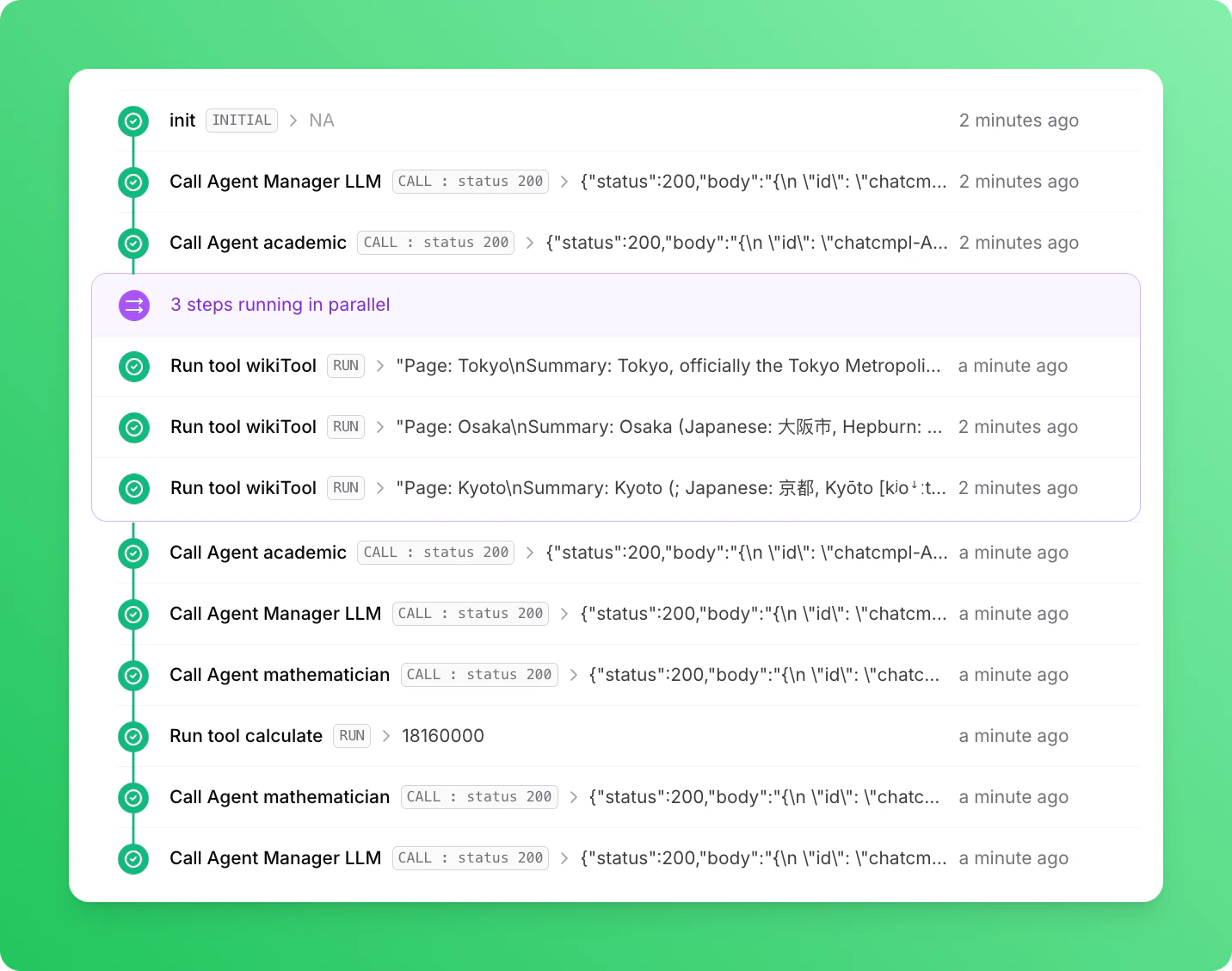 Here are the logs on Upstash Console: The logs show that the Manager LLM first called the academic agent. The academic agent used the wikiTool three times, each with a different Japanese city, and summarized the results. Next, the Manager LLM called the mathematician agent, which used its calculate tool to compute the total population of the three cities and returned the result to the Manager LLM. With information about the cities and their total population, the Manager LLM generated the final response.