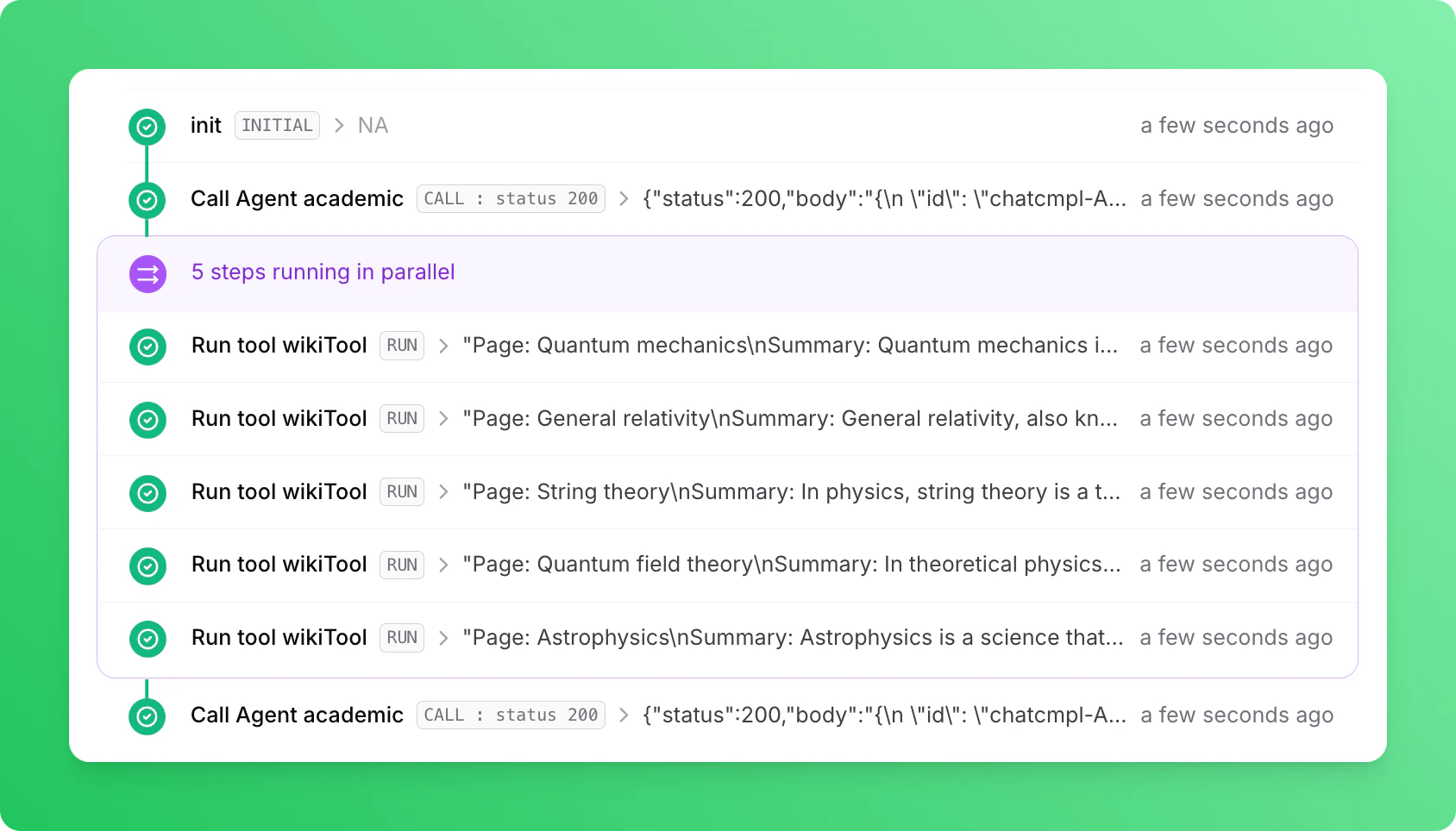 Here is the logs on Upstash Console: In the logs, you can see that the academic agent was called. It decided to invoke wikiTool five times in parallel. Once the tool requests were completed, the agent summarized the results from the individual calls in one final response and returned the outcome.