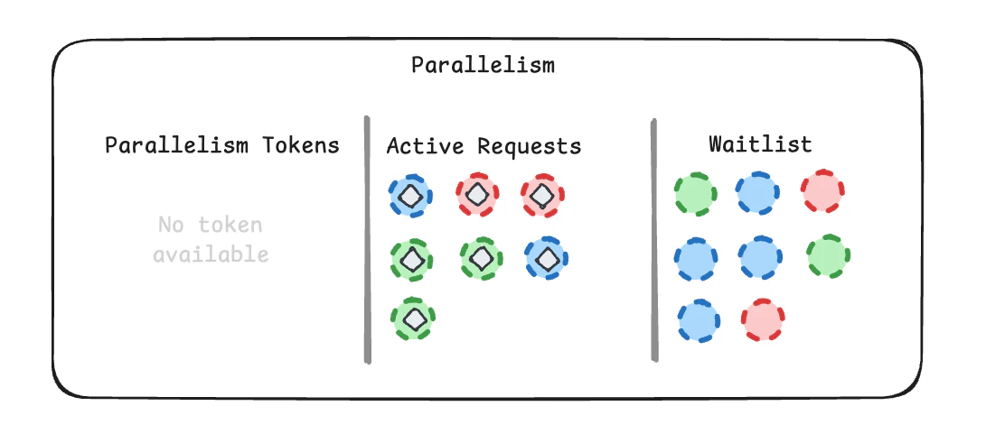 Note that each step above corresponds to a separate workflow run. Because this workflow is sequential, each workflow run has only one pending step at a time. In workflows with parallel branches, multiple steps from the same workflow run may appear in the schedule simultaneously. Parallelism slots are consumed by running steps. If no slots are available, new steps enter the waitlist until resources free up: