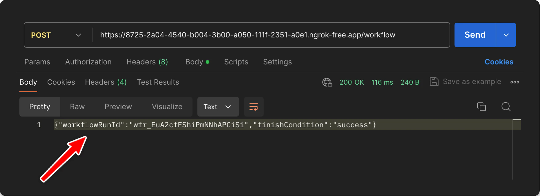 After defining the endpoint, you can trigger your workflow by starting your app:Terminal